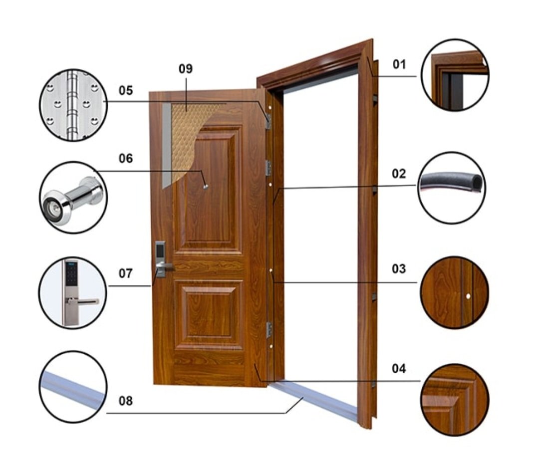 - Cánh cửa: dày từ 1mm - 2 mm. Cánh cửa được cấu tạo 3 lớp với 2 tấm thép phía ngoài và lõi giữa được làm từ Honeycomb paper có độ dày 60mm.