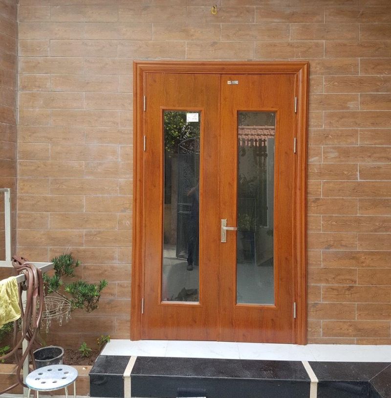 Thời gian gần đây, những mẫu cửa 2 cánh cũng dần trở nên phổ biến và được ưa chuộng hơn. Đây là sản phẩm nổi bật với sắc nâu sáng. Phần cửa khung được làm giả gỗ với sơn phủ chất lượng cao. Kết hợp với đó là 2 ô kính lớn, chạy dài dọc theo chiều đứng của cửa.