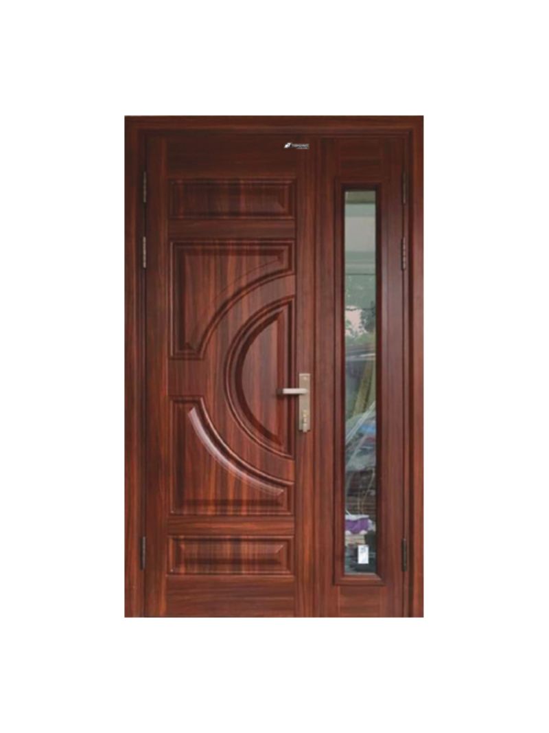 Đây là một mẫu cửa thép màu nâu chống cháy bán chạy, được yêu thích bậc nhất trên thị trường. Sử dụng lớp dán/phủ tạo màu như gỗ thật, sản phẩm này tạo ấn tượng về sự hiện đại nhờ những ô kính tinh tế. Những mảng kính này tạo thành viền và ô trung tâm, tạo điểm nhấn nổi bật cho cửa.