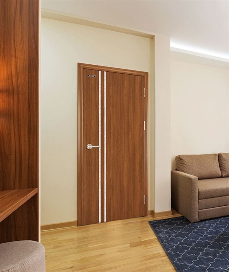 Mẫu cửa một cánh này rất quen thuộc trong thiết kế chung cư. Cửa có vân gỗ tự nhiên đẹp với 2 sọc trắng chạy dài tạo diểm nhấn. Nó giúp cửa trở nên hiện đại và phù hợp với những căn nhà có diện tích phải chăng.
